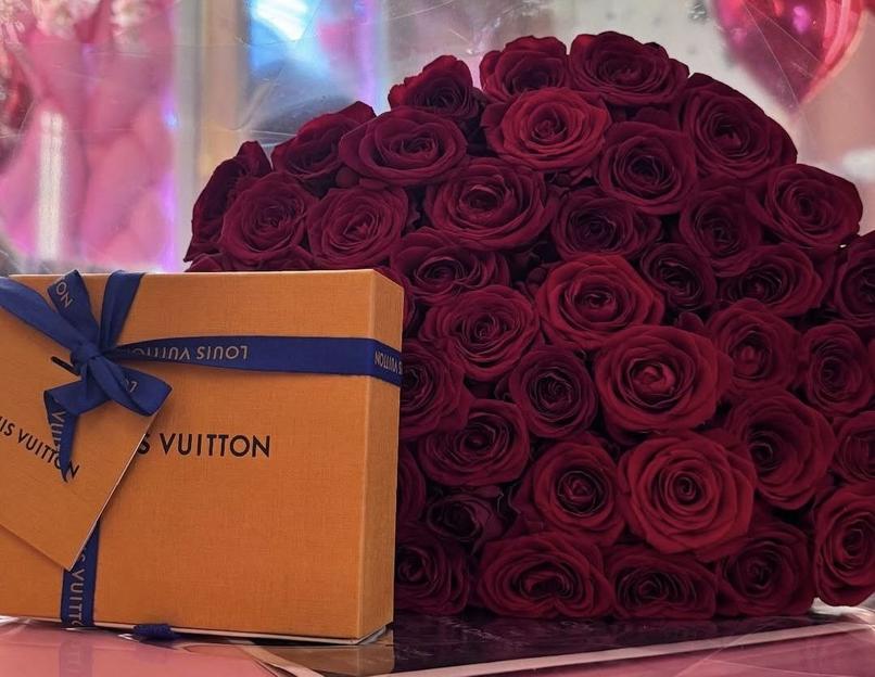 Коробка «Луи Виттон» и большой букет роз: