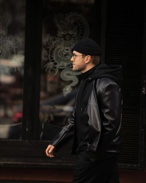 Влад Соколовский продемонстрировал образ в стиле total black. Он примерил модную шапку бини и кожаный бомбер.