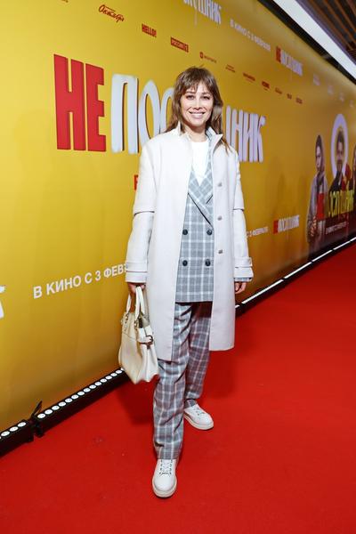 Исполнительница одной из главных ролей в комедии Аглая Тарасова прибыла на показ в коротком шелковом платье-жакете и белом топе. Стилисты нанесли ей легкий макияж, а волосы собрали в гладкий хвост. Из украшений актриса выбрала большие серьги-кольца, а из аксессуаров — серебристый клатч.