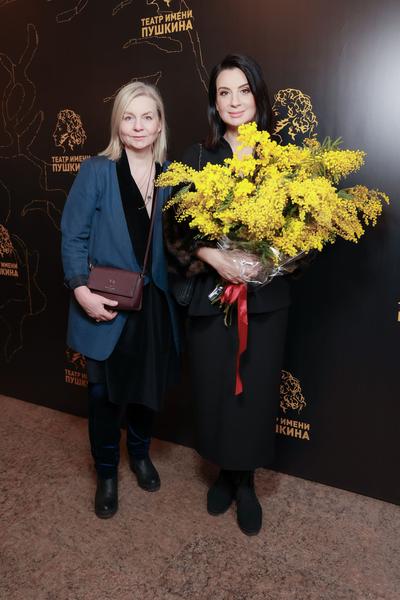 Екатерина Стриженова побывала на премьере в компании сестры, дизайнера Виктории Андреяновой. Для именинницы они приготовили огромный букет мимозы.