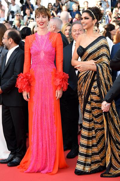«Мисс Франция» и «Мисс Вселенная — 2016» Айрис Миттенар появилась на красной дорожке в Каннах в шикарном платье Mugler с разрезом до бедра и золотым лифом. Образ модель дополнила туфлями в греческом стиле René Caovilla и драгоценностями Boucheron.