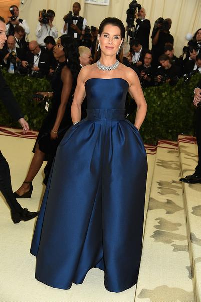 Незадолго до этого в классическом total black блистала Брук Шилдс, которая пришла поддержать друга, дизайнера Майкла Корса, на его показе в рамках Недели моды в Нью-Йорке. Звезда кино вооружилась зауженными брюками ультравысокой посадки и кроп-жакетом, напоминающим мужской фрак. Акцентами образа стали клатч, усыпанный кристаллами, и жгуче-алая помада.