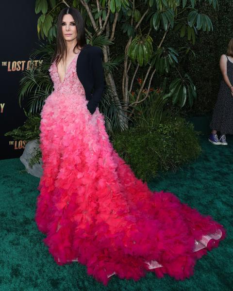 Голливудская звезда показала эффектный образ на премьере фильма «Затерянный город» в Лос-Анджелесе. Сандра сделала выбор в пользу неоново-розового платья Elie Saab с эффектом градиента и декольте до талии. Наряд украсили многочисленные цветы, которыми был усыпан даже длинный подол.