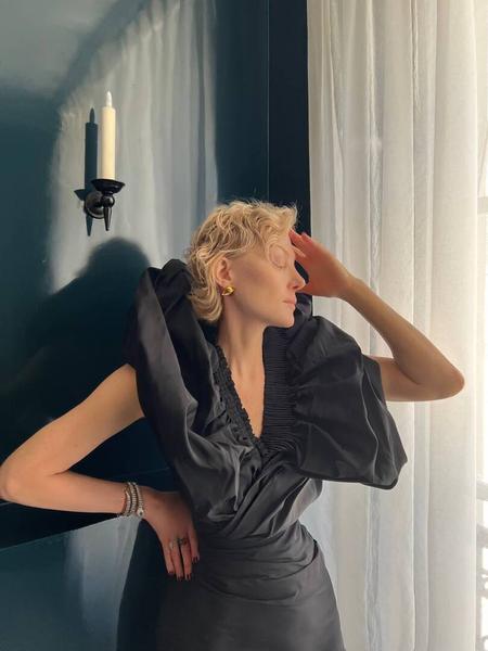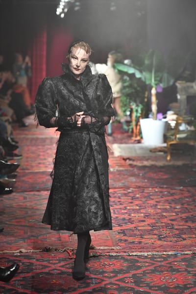 Один из образов представила Рената Литвинова, которую Демна Гвасалия вновь пригласил принять участие в показе. Актриса вышла силуэтном миди-платье, декорированном драматичными перьями. Дополняли образ высокие перчатки, плотные черные колготки и туфли затейливого дизайна. Из зрительного зала звезду поддерживали ее дочь Ульяна Добровская и певица Земфира.
