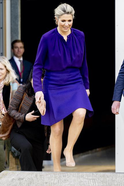 И действительно, королева Максима в последнее время пристрастилась к брюкам-палаццо и платьям длины мидакси. Поэтому образ с юбкой-колоколом выше колен в исполнении ее светлости заслуживает внимания. Супруга Виллема-Александра не только показала стройные ноги с лучших ракурсов, но и совершила оммаж самому королевскому цвету — насыщенному лиловому. Кроме того, он является символом движения суфражисток.