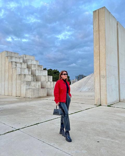 Но главная фишка наряда — мегастильная джинсовая куртка цвета спелой клубники — предмет охоты и зависти многих модниц. Певица дополнила аутфит мини-сумочкой с серебряной фурнитурой и массивными сапогами на шнуровке. Образ завершили классические серьги-кольца.