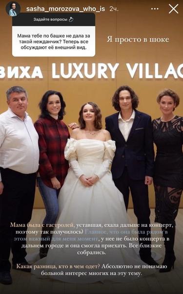 «Мама была с гастролей, уставшая, ехала дальше на концерт, поэтому так получилось. Главное, что она была рядом в этот важный для меня момент, у нее не было концерта в дальнем городе, и она смогла приехать. Все близкие собрались. Какая разница, кто и во что одет?» – ответила девушка.