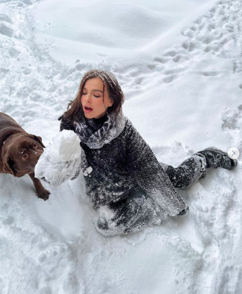 Тем временем бывшая коллега Серябкиной по группе Serebro Елена Темникова тоже показала публике свою собаку. В снегу. И поздравила всех со старым Новым годом.