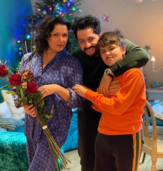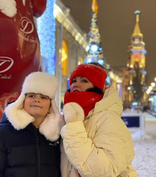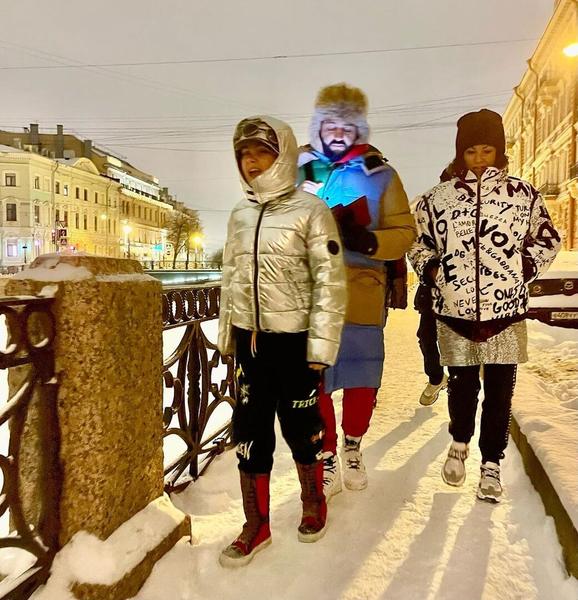 Нетребко в леопардовых лосинах прогулялась с мужем и сыном по заснеженному Петербургу