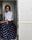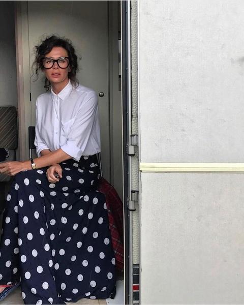 В последнем посте в своем блоге Фандера предстала в новом модном образе. Она надела темную юбку в пол с модным принтом в горошек, плотную белую рубашку бойфренда и дополнила образ массивными очками с толстой оправой.