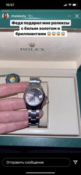 «Вы даже не представляете, что мне подарил мой бешеный мужчина. Я до сих пор в шоке», — призналась Дакота своим подписчикам в Instagram. После чего показала часы Rolex, отметив, что эта модель украшена белым золотом и бриллиантами. По словам певицы, все ее знакомые и друзья были в курсе подарка: Федор рассказал о «ролексах» в сторис своего Instagram-аккаунта, но сделал так, что Дакота эту публикацию не увидела.