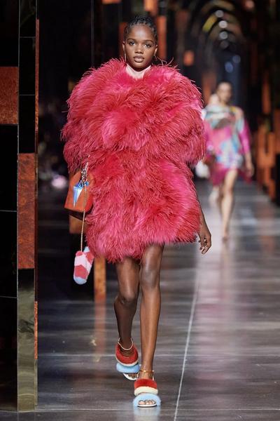 О перьях мы периодически вспоминаем под Новый год, но дизайнеры предложили сделать праздник перманентным явлением. Много перьев было в коллекции Christian Cowan, где они дополняли крошечные юбки и венчали головные уборы-коконы. У Fendi мы встретили вариант для смелых — объемную многоцветную шубу, которая эффектно смотрится в паре с атласными палаццо и босоножками.