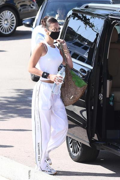 Спортивные костюмы с олимпийкой и трениками расширяют зоны влияния, и на этот раз дошли до стритстайла Беллы Хадид. Образ модель обрамила трендовыми аксессуарами — брутальными кожаными перчатками, шоколадной сумкой на коротком ремешке и очками как у велосипедиста. Место кроссовок заняли грубые ботинки — советуем взять трюк на вооружение для капризной погоды.