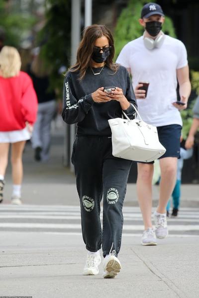 Неспешные выходные Ирина Шейк предпочитает проводить в компании дочери Леи, стаканчика кофе и свежей выпечки. Для прогулок модель выбирает свободные треники и свитшот, дополняет их объемной дубленкой и любимой сумкой Cush от By Far.